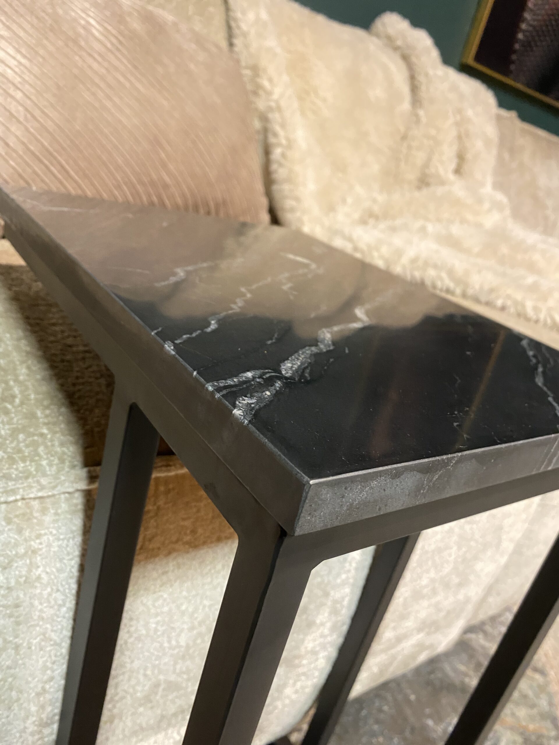 Deze zwarte slider is uitgevoerd met zwart marmer blad. Het frame is gemaakt van metaal en is afgewerkt met een zwarte lak.